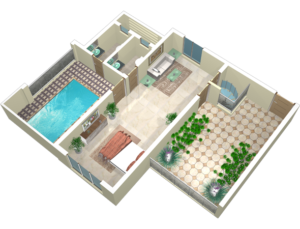 | Toilet/Bath | – | Toilet/bath full wall cladding in digital tiles. WC, Wash basin and shower with mixer. |
